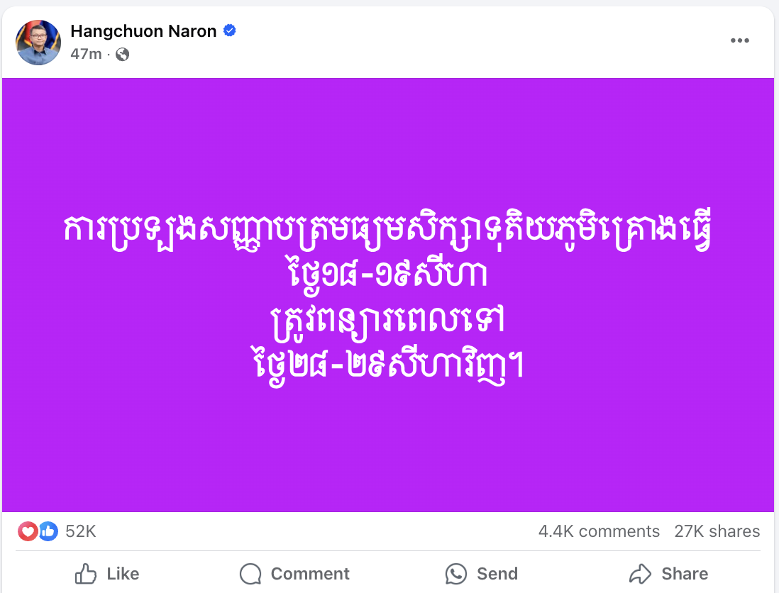 On his social media Facebook account, Deputy Prime Minister Hang Chuon Naron posted on July 27, 2025, stating, “The Baccalaureate Examination scheduled for August 18-19, will be postponed to August 28-29.” The ministry cited logistical considerations and the need for additional preparation as reasons for the adjustment to the examination timetable.