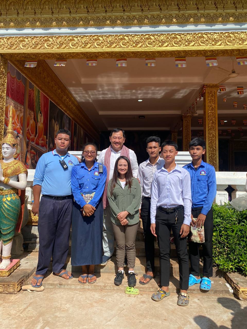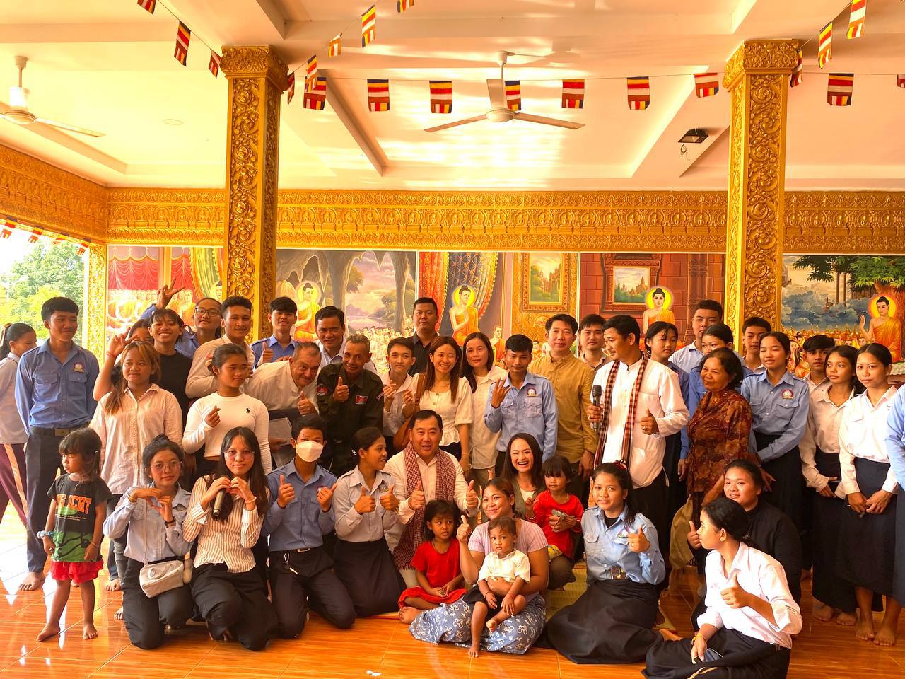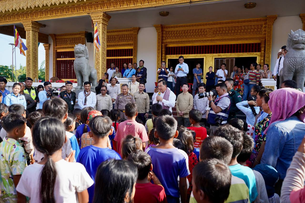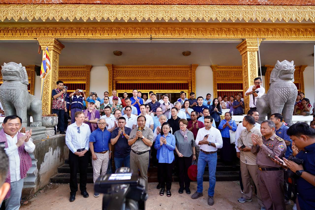 In Kouk Mon district — less than 20 kilometers from the Thai border — they inspected local dwellings and a temple that had been shelled and bombed by the Thai military before the ceasefire came into effect on Monday