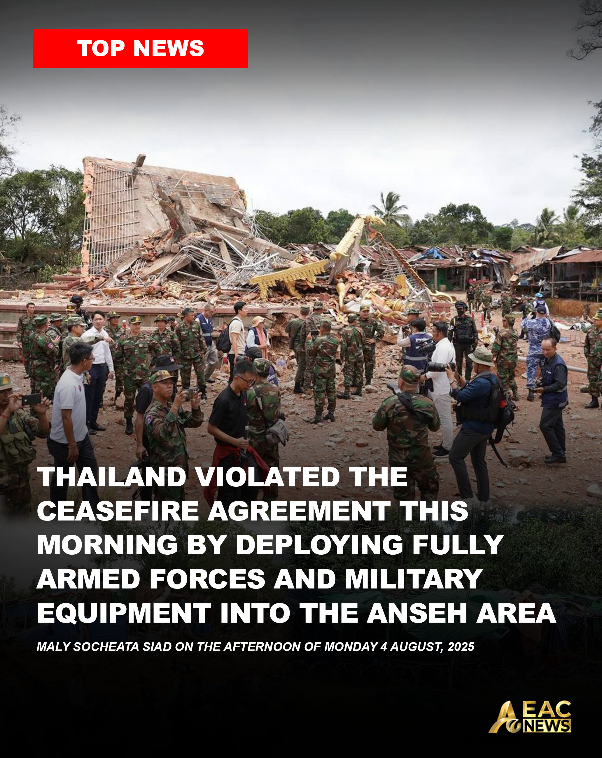 Phnom Penh, August 4, 2025 — The Ministry of National Defense of Cambodia has issued an official statement condemning the action of Thai armed forces, who entered Cambodian sovereign territory in the An Ses area this morning at 11 a.m. Accompanying their movement were heavy machinery, including excavators, and the forces proceeded to lay barbed wire within the disputed region, despite strong objections from Cambodian military personnel.