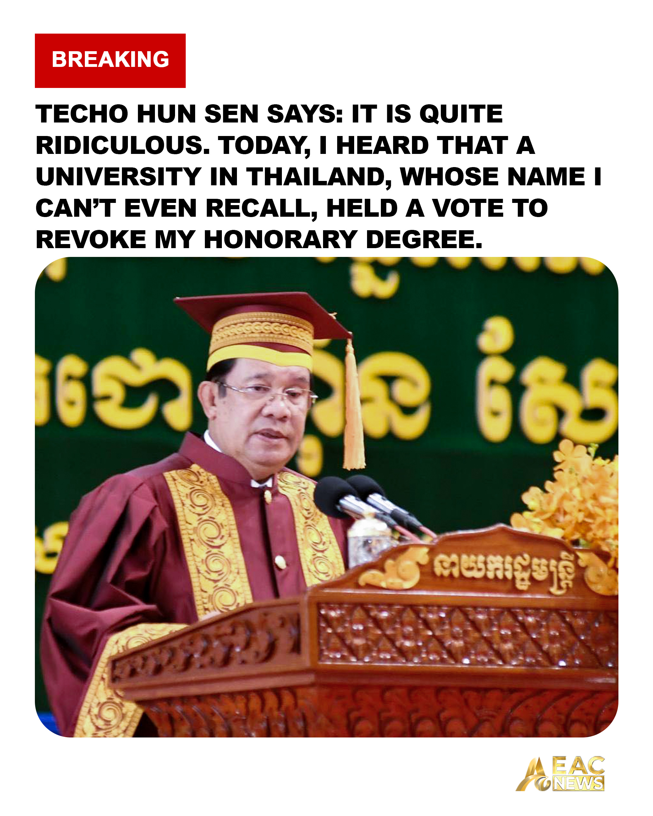 “It is quite ridiculous,” Techo Hun Sen wrote. “Today, I heard that a university in Thailand, whose name I can’t even recall, held a vote to revoke my honorary degree.”