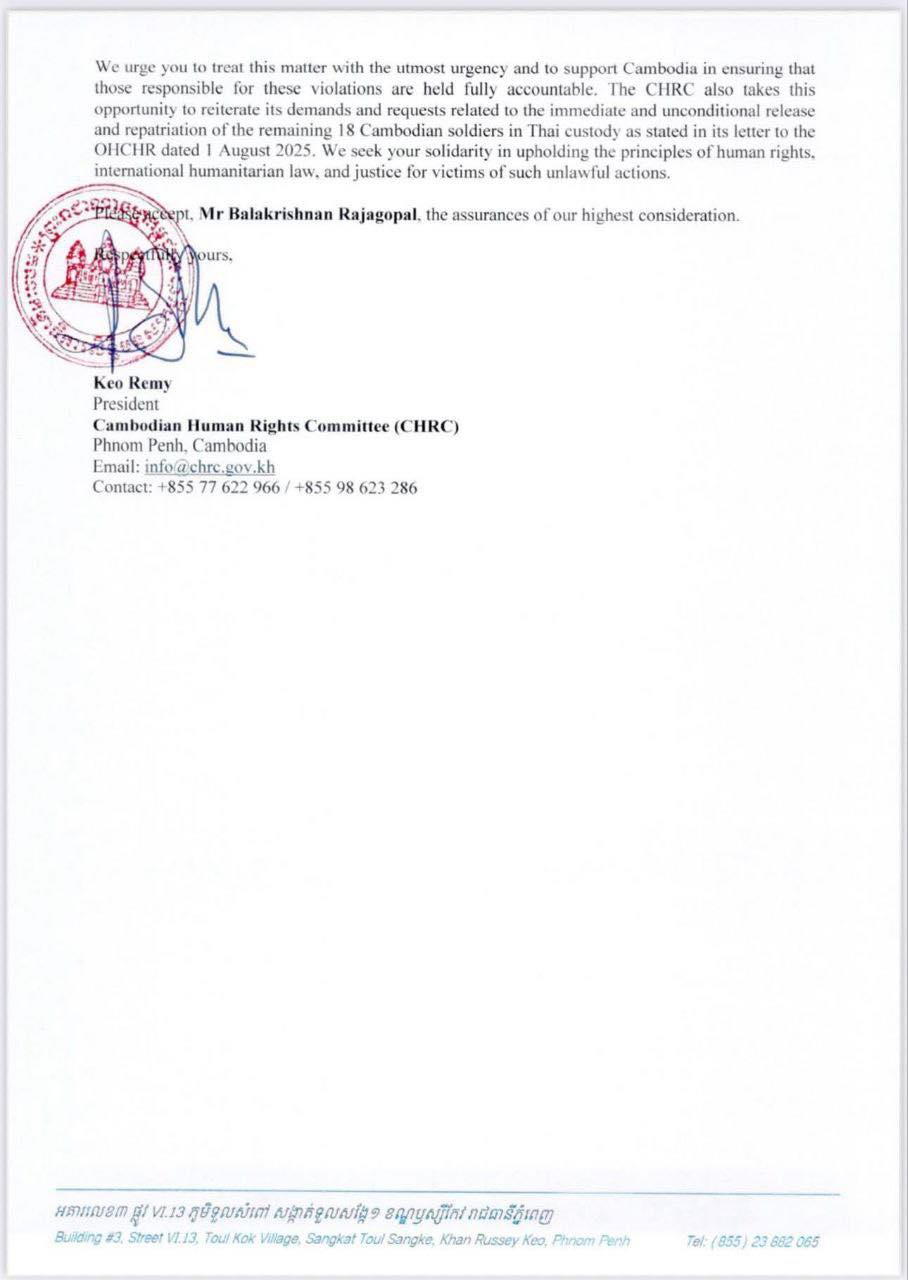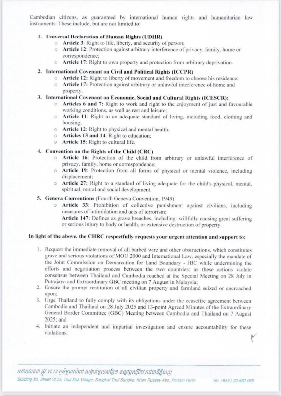 The CHRC is urging the UN Special Rapporteur to use his office to press for a resolution to the escalating situation and ensure the protection of Cambodian citizens' rights along the border.