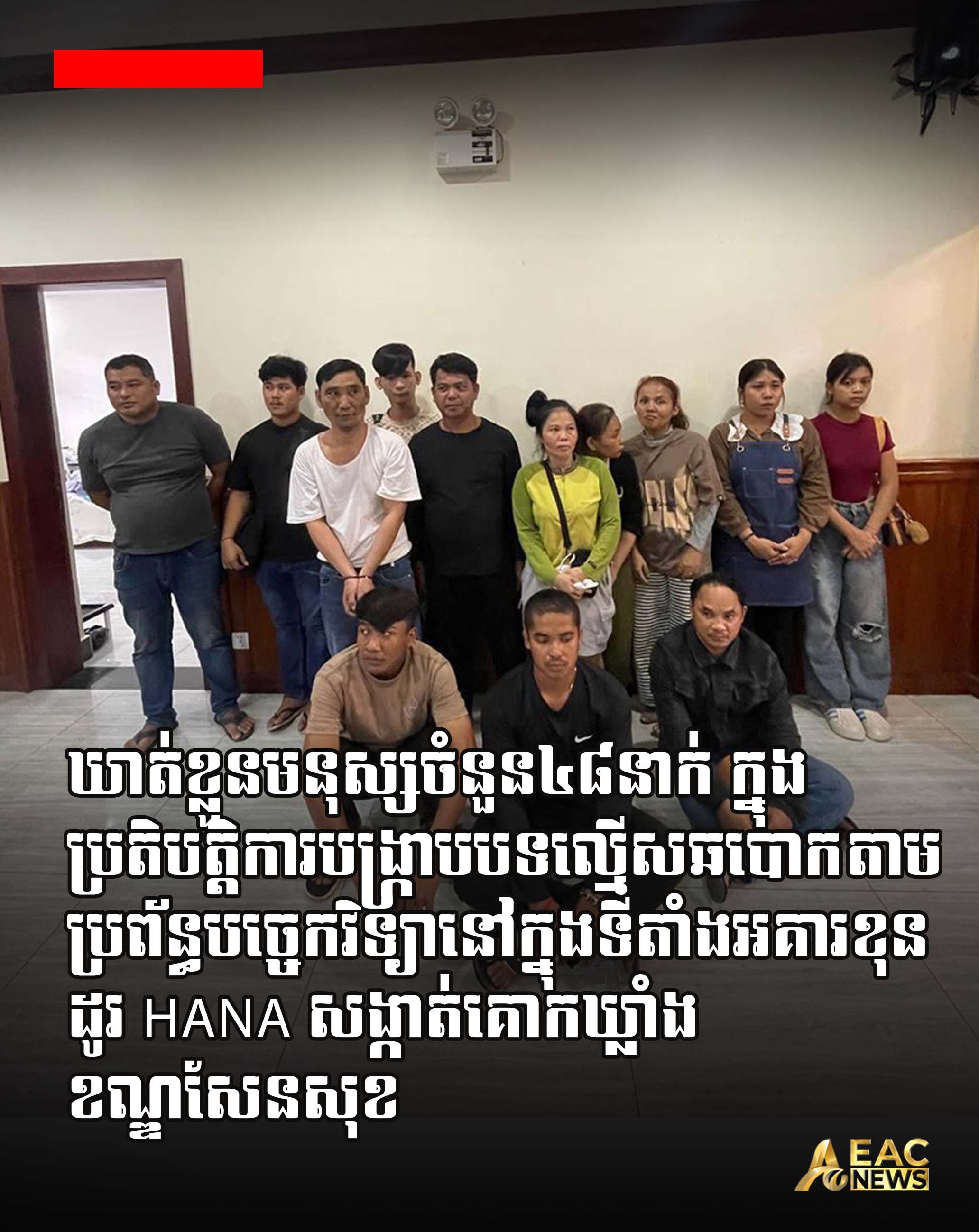 ឃាត់ខ្លួនមនុស្សចំនួន៤៨នាក់ ក្នុងប្រតិបត្តិការបង្ក្រាបបទល្មើសឆបោក តាមប្រព័ន្ធបច្ចេកវិទ្យានៅក្នុងទីតាំងអគារខុនដូរ HANA សង្កាត់គោកឃ្លាង ខណ្ឌសែនសុខ