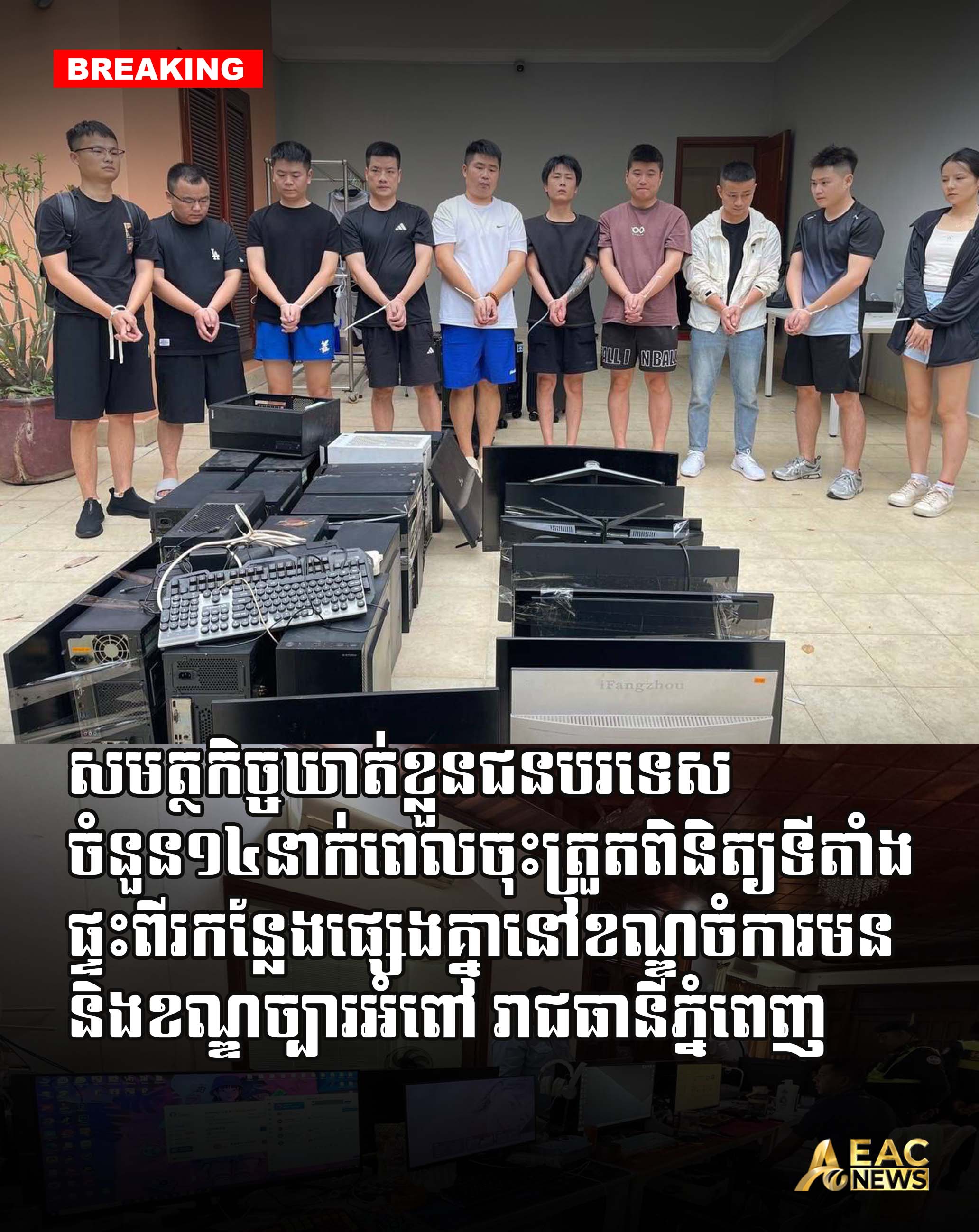 សមត្ថកិច្ចឃាត់ខ្លួនជនបរទេសចំនួន១៤នាក់ពេលចុះត្រួតពិនិត្យទីតាំងផ្ទះពីរកន្លែងផ្សេងគ្នានៅខណ្ឌចំការមន និងខណ្ឌច្បារអំពៅ រាជធានីភ្នំពេញ