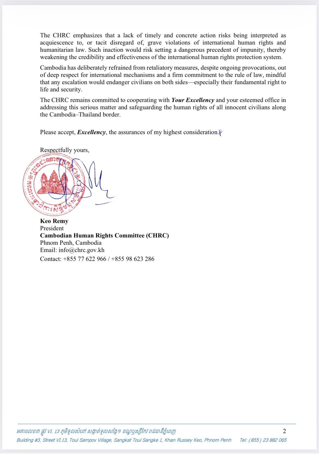 Phnom Penh, October 17, 2025 — Keo Remy, President of the Cambodian Human Rights Committee (CHRC) has issued a serious warning to the international community regarding ongoing human rights violations along the Cambodia-Thailand border. In a letter addressed to United Nations High Commissioner for Human Rights Volker Türk, the CHRC reiterated its urgent appeal for the UN to investigate and intervene in reports of the use of extreme noise as a method of psychological persecution by Thai armed forces.