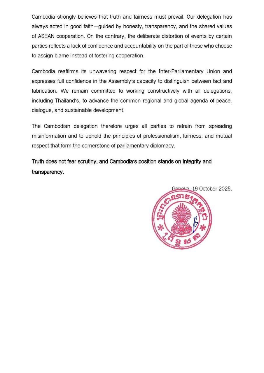 GENEVA — October 20, 2025 — The Delegation of Cambodia to the 151st Inter-Parliamentary Union (IPU) Assembly in Geneva issued a strong statement today rejecting a false and misleading report published by the Thai newspaper The Nation.