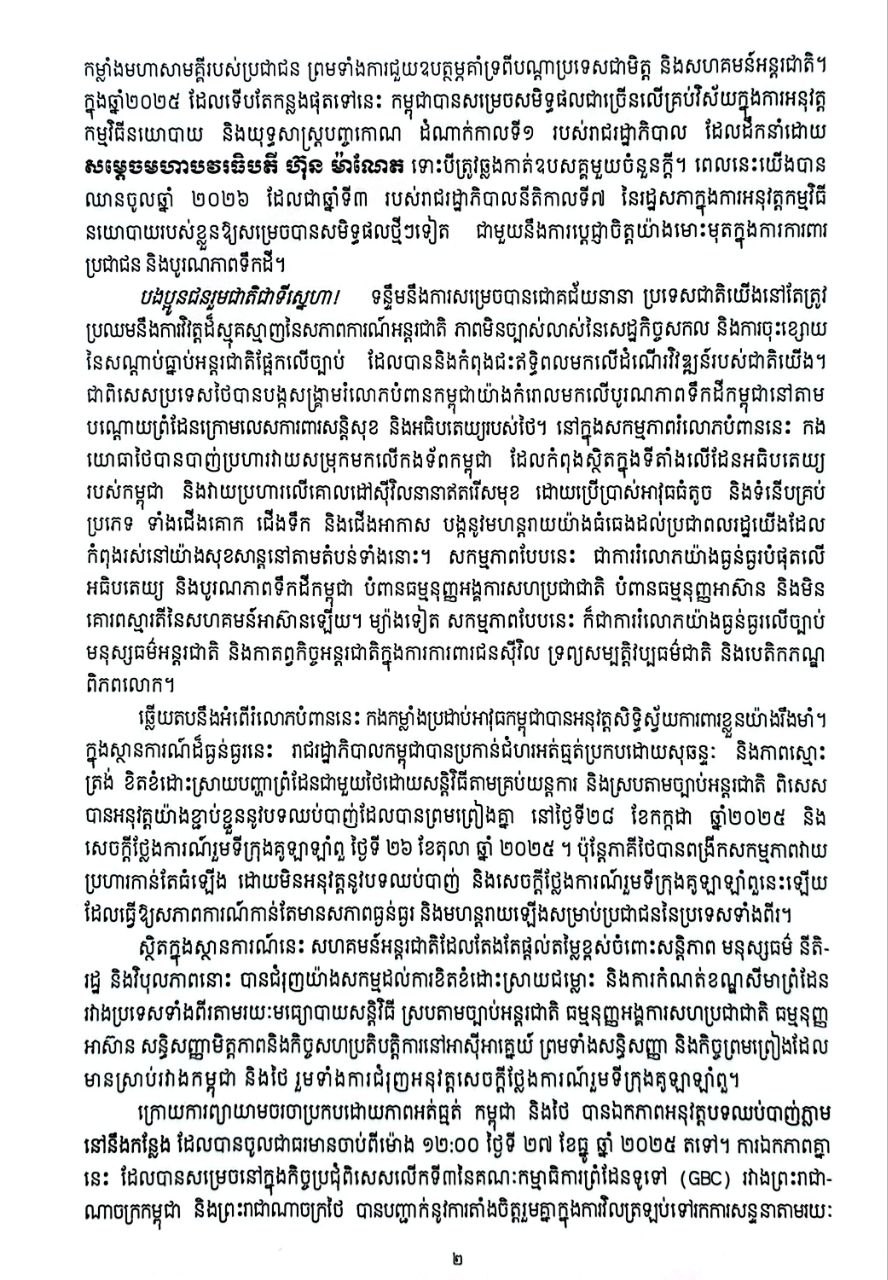 ក្រឡេកមើលទៅឆ្នាំ២០២៥ សម្តេច ហ៊ុន សែន បានកត់សម្គាល់ថា កម្ពុជាសម្រេចបាន «សមិទ្ធផលជាច្រើនលើគ្រប់វិស័យ» តាមរយៈការអនុវត្តកម្មវិធីនយោបាយ និងយុទ្ធសាស្ត្របញ្ចកោណដំណាក់កាលទី១ របស់រាជរដ្ឋាភិបាល ដែលដឹកនាំដោយ សម្តេចមហាបវរធិបតី ហ៊ុន ម៉ាណែត។ សម្តេចតេជោបានបញ្ជាក់ថា ឆ្នាំ២០២៦ ដែលជាឆ្នាំទី៣ នៃអាណត្តិរដ្ឋាភិបាលបច្ចុប្បន្ន នឹងបន្តអនុវត្តកម្មវិធីនយោបាយ និងការពារប្រជាជន ព្រមទាំងបូរណភាពទឹកដី។