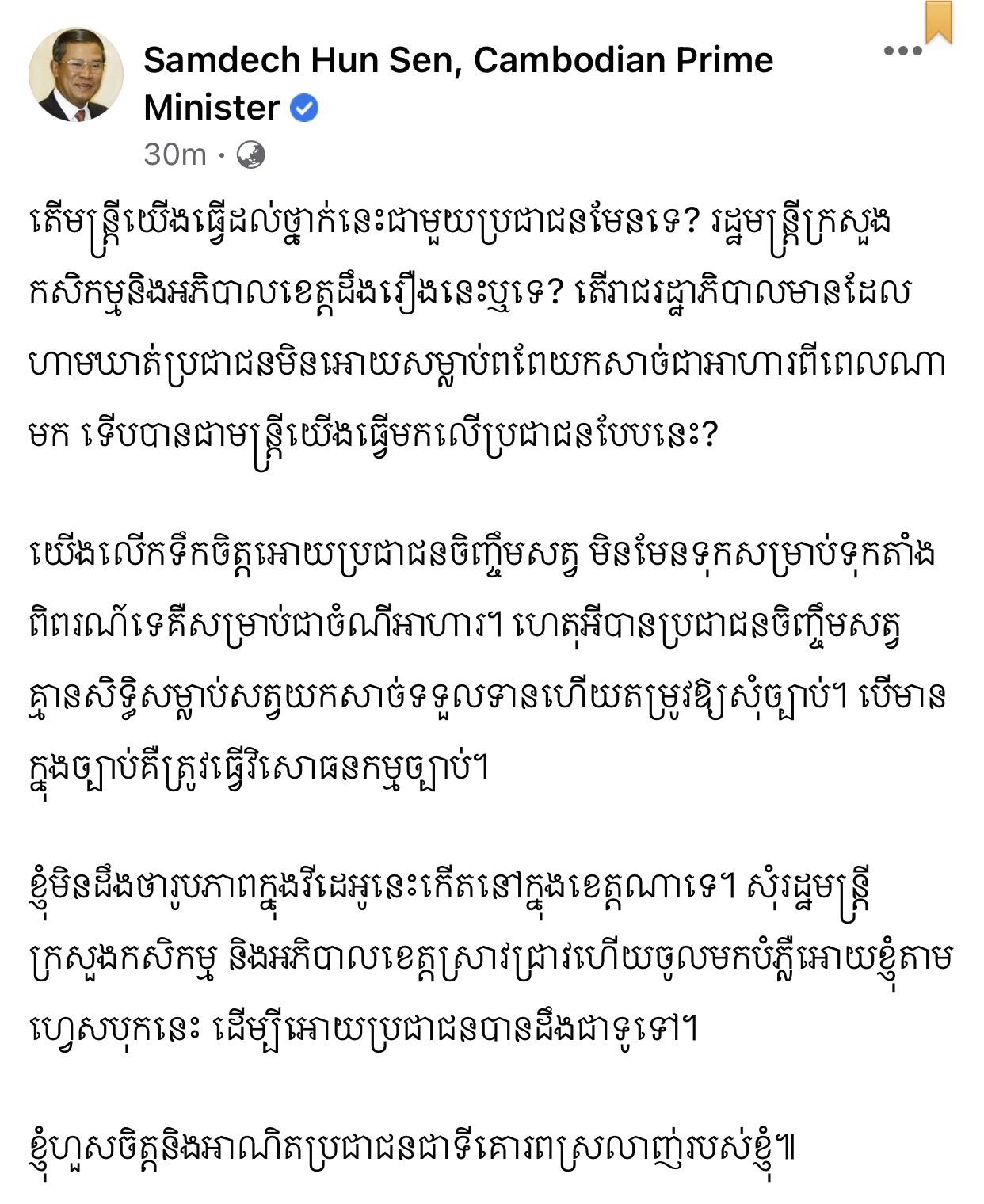 សម្ដេចតេជោ ហ៊ុន សែន សរសេរក្នុងហ្វេសបុកផេករបស់សម្ដេចនៅព្រឹកនេះថា៖ «យើងលើកទឹកចិត្តអោយប្រជាជនចិញ្ចឹមសត្វ មិនមែនទុកសម្រាប់ទុកតាំងពិព័រណ៍ទេគឺសម្រាប់ជាចំណីអាហារ។ ហេតុអីបានប្រជាជនចិញ្ចឹមសត្វគ្មានសិទ្ធិសម្លាប់សត្វយកសាច់ទទួលទានហើយតម្រូវអោយសុំច្បាប់។ បើមានក្នុងច្បាប់គឺត្រូវធ្វើវិសោធនកម្មច្បាប់»។