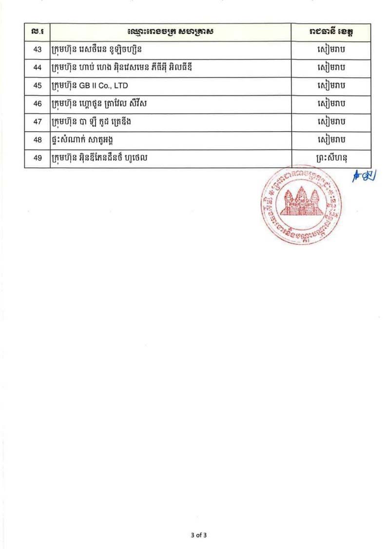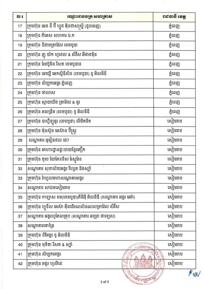 ភ្នំពេញ : នៅថ្ងៃសុក្រ ទី២១ ខែឧសភា ឆ្នាំ២០២១ ក្រសួងការងារ និងបណ្តុះបណ្តាលវជា្ជជីវៈ បានប្រកាសដល់បងប្អូនកម្មករនិយោជិតចំនួន៨៦៩៣នាក់ នៃរោងចក្រ សហគ្រាសទាំង៤៩ នៃវិស័យកាត់ដេរ និងវិស័យទេសចរណ៍ ( ដូចមានភ្ជាប់នៅក្នុងឧបសម្ព័ន្ធ ) ដែលទទួលបានការអនុញ្ញាតព្យួរកិច្ចសន្យាការងារស្របតាមស្មារតីជុំទី៣នៃកញ្ចប់វិធានការរបស់រាជរដ្ឋាភិបាលជ្រាបថា ធនាគារឯកទេសវីង នឹងផ្ញើរសារអំពីការបើកប្រាក់ឧបត្ថម្ភរបស់រាជរដ្ឋាភិបាលទៅលេខទូរស័ព្ទ ដែលបងប្អូនបានផ្ដល់មកឱ្យក្រសួងតាមរយៈរដ្ឋបាលរោងចក្រ សហគ្រាសនាពេលកន្លងមក។